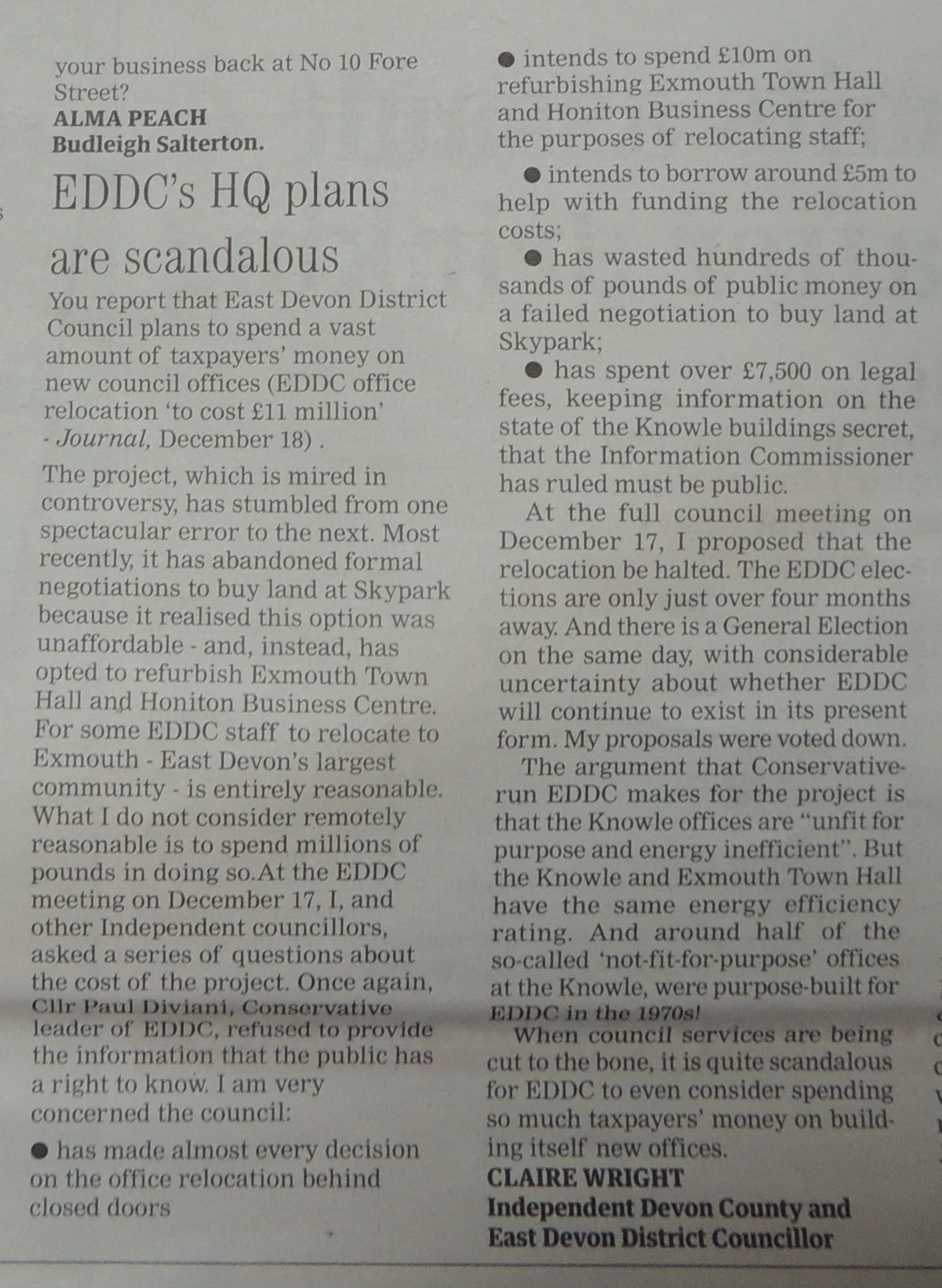 Compare the two glowing pages on Swire’s international profile to the succinct and straightforward letter from Independent Parliamentary candidate Claire Wright in the same newspaper on Knowle relocation: