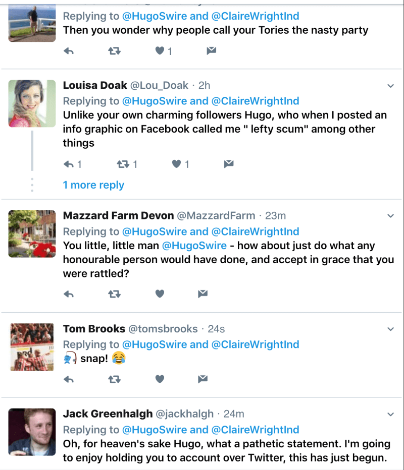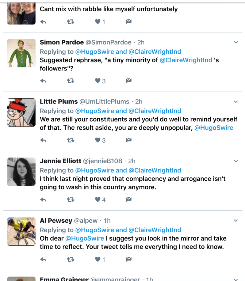 Hugo has excelled himself this time. Not only is he entirely unwilling to be held to account by his constituents but instead, when they call him out on what he has said and done (or rather said and not done), decides to call them “vile” and unmannered.