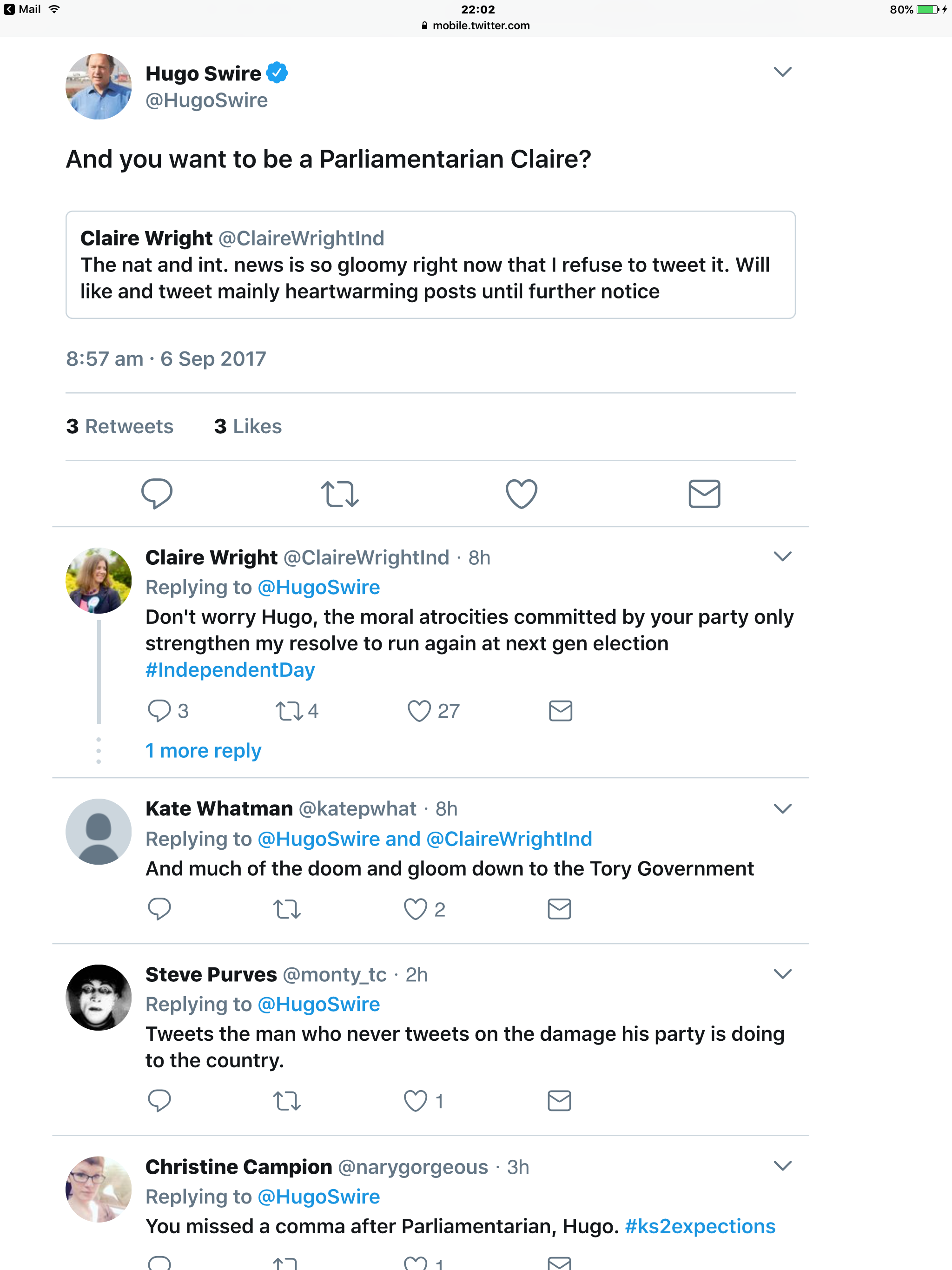 So, there you can see the difference between Swire and Wright – carelessness and bitterness on his part and caring and compassion on Claire Wright’s part.