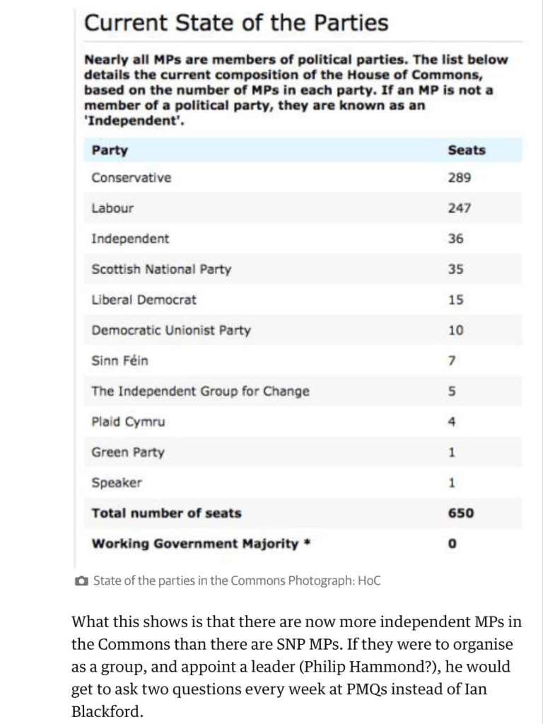 Standard Posted by East Devon Watch Posted on 4 Sep 2019 Posted under Accountability, Democracy, Voting Confused? The current (but ever-changing) state of the parties Source: Guardian Share this: Click to share on Facebook (Opens in new window) Facebook Click to share on X (Opens in new window) X Click to email a link to a friend (Opens in new window) Email Click to print (Opens in new window) Print Like Loading... Related