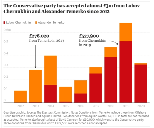 The Conservatives have received more than £3m from wealthy Soviet-born donors – all of whom can legally give money to the party as British citizens. They include Alexander Temerko, a former Russian junior defence minister, and Lubov Chernukhin, a financier whose husband Vladimir served in Putin’s cabinet as deputy finance minister.