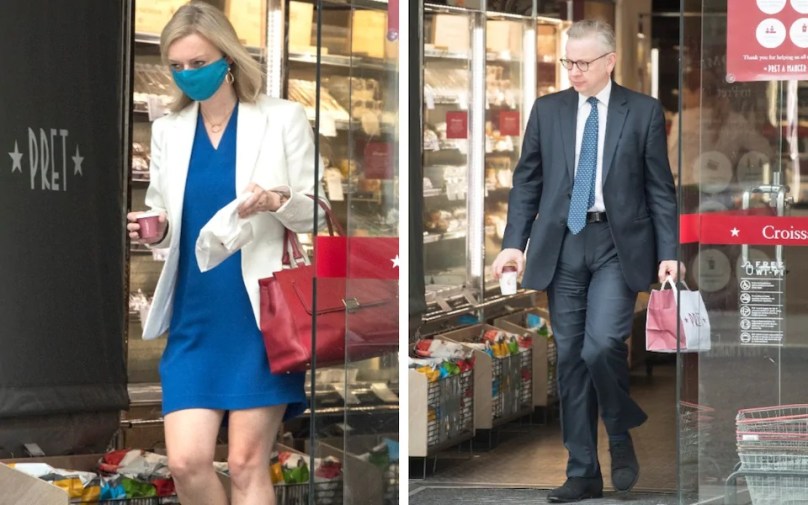 This picture appears on the front page of today’s Telegraph. The caption reads: “Cabinet colleagues Liz Truss and Michael Gove visit the same Pret a Manger in Westminster on Tuesday, one wearing a mask and one without.”