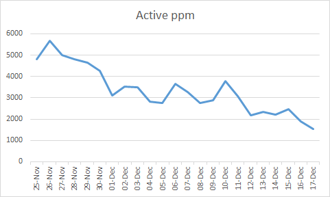 For the moment the local picture is looking encouraging as can be seen in the graph below which plots the number of active cases estimated from the app per million (generally elsewhere reports have standardised on cases per 100,000). It is really only the app. that has a sufficient daily sample to provide such a picture at local level. Before Owl started a daily record, the East Devon case rate was double that shown. What this indicates is that the infection appears to be still slowly falling in East Devon, despite the relaxation from Lockdown 2 to the revised Tier* system. Lockdown 2 started on 5 November and ended on 2 December.