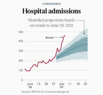 In reality on July 7, the latest date for which figures are available, there were 461 people admitted to hospital in England, and admissions were rising at a significantly higher rate than expected.