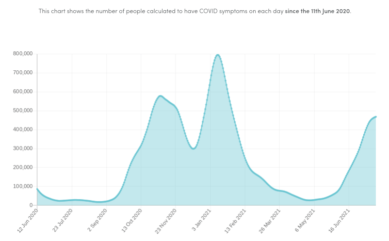 The ZOE COVID Study incidence figures (new symptomatic cases) are based on reports from around one million weekly contributors and the proportion of newly symptomatic users who have received positive swab tests. The latest survey figures were based on data from 10,303 recent swab tests done between 26 June and 11 July 2021. The data excludes lateral flow tests.