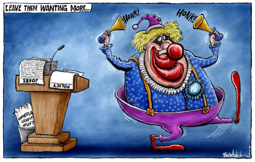 Outside the hall, Mr Johnson’s boosterism and cheesy gags felt very much out of place. Perhaps it was bad luck or poor planning, but the speech was delivered shortly after about 1 million workers had come off the furlough support scheme, and on the very day that 6 million families were to suffer a reduction in their income of about £20, thanks to the end of the uplift in universal credit.
