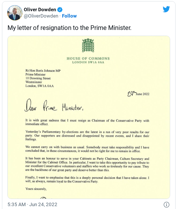 Mr Dowden resigned as Conservative party co-chair hours after it became clear that the Tories had been defeated by Labour in Wakefield and by the Liberal Democrats in Tiverton & Honiton.