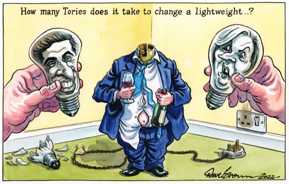 Standard Posted by East Devon Watch Posted on 22 Jul 2022 Posted under Misc How many Tories does it take… …..to change a lightweight? Share this: Click to share on Facebook (Opens in new window) Facebook Click to share on X (Opens in new window) X Click to email a link to a friend (Opens in new window) Email Click to print (Opens in new window) Print Like Loading... Related