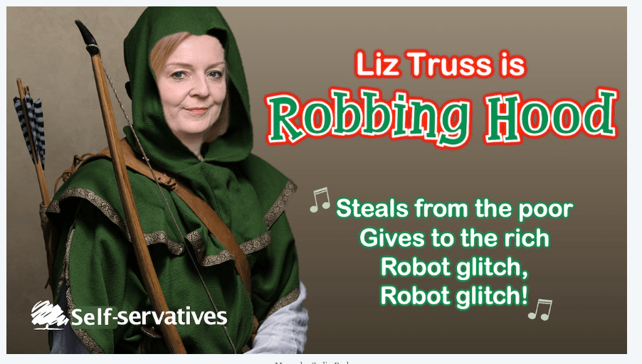 Standard Posted by East Devon Watch Posted on 1 Oct 2022 Posted under Misc Self-servatives present: Robbing Hood The Autumn pantomime now opening in Birmingham Image from westcountryvoices.co.uk / Share this: Click to share on Facebook (Opens in new window) Facebook Click to share on X (Opens in new window) X Click to email a link to a friend (Opens in new window) Email Click to print (Opens in new window) Print Like Loading... Related