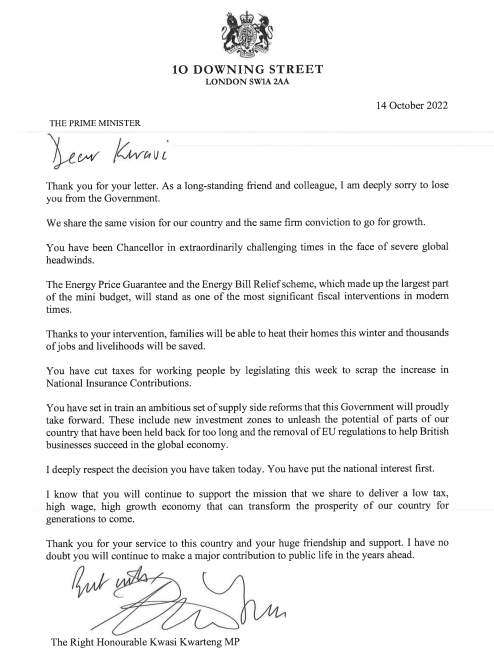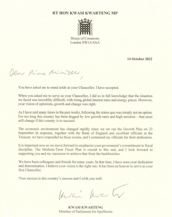 Read the exchange of letters following Kwarteng’s resignation and decide whether Kwarteng alone should be held to account for the failed mini-budget or whether it is matter of “joint enterprise” between him and Liz Truss