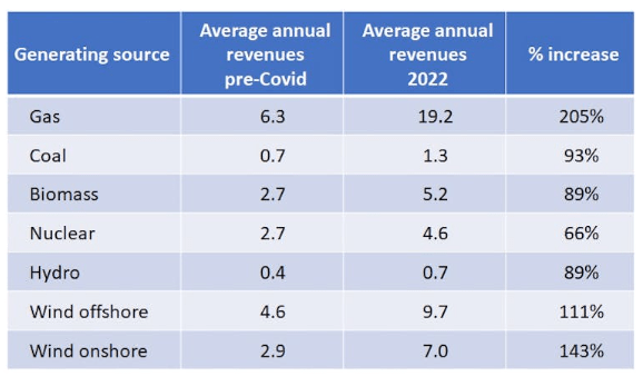 A key finding from our research is how revenue changed for different generators, with the growth for renewables of particular note. We estimate their revenue doubled from £7.7 billion pre-COVID to £15.5 billion in 2022 – yet there is no reason to think their costs increased.