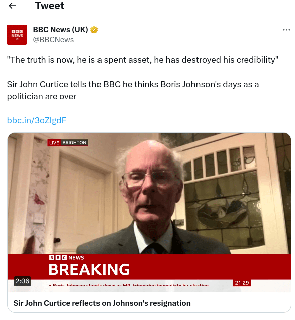Standard Posted by East Devon Watch Posted on 10 Jun 2023 Posted under Misc “The truth is now, he is a spent asset” and other headlines “The truth is now, he is a spent asset, he has destroyed his credibility” – Sir John Curtice. Share this: Click to share on Facebook (Opens in new window) Facebook Click to share on X (Opens in new window) X Click to email a link to a friend (Opens in new window) Email Click to print (Opens in new window) Print Like Loading... Related