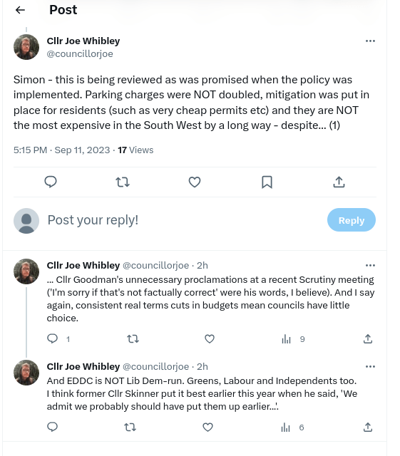 On cue, Simon Jupp launched forth on twitter about the impact of parking charges imposed by the “LibDem – run EDDC” (see below).