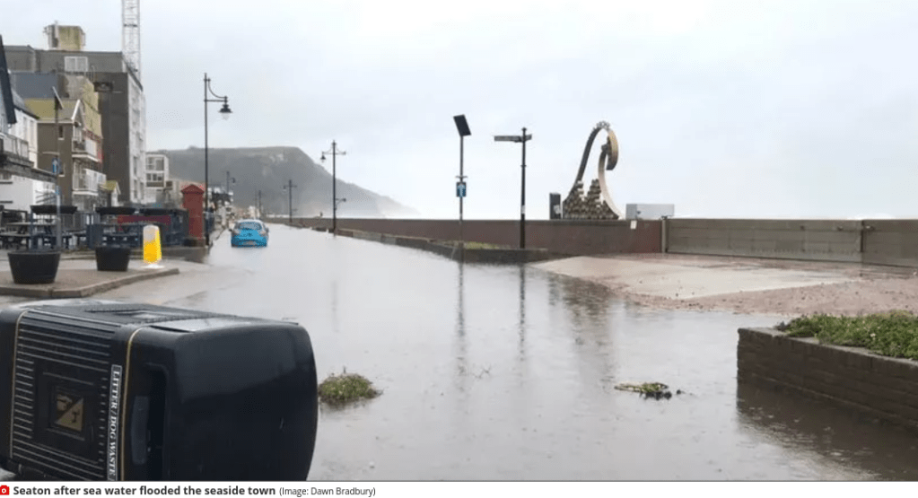 Residents living in Seaton in East Devon have endured a day to forget after they awoke to find sea water had breached the town’s defences. Water flooded the streets and video captured earlier today shows how the seaside town was transformed into a mini-river.