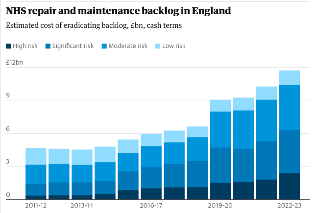 The cost of the “high-risk” backlog – situations where the need to repair or replace facilities and equipment must be urgently addressed to prevent serious failure, significant injury or major disruption to clinical services – rose by almost a third to a record £2.4bn. This was £0.3bn in 2011-2012.