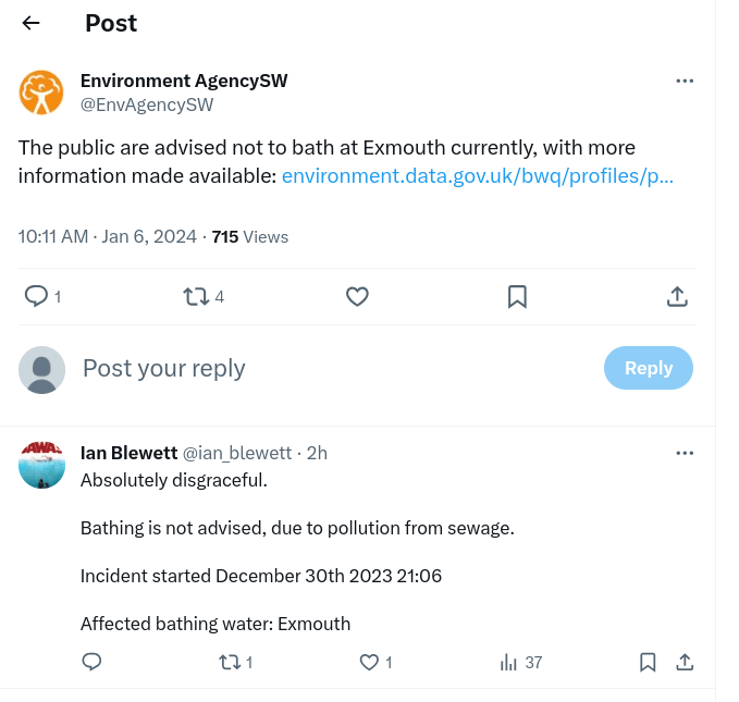 The Environment Agency was asked if it was investigating South West Water’s actions in Exmouth but it had not responded at the time of publication.