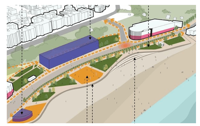 At the seafront, the firm explains how Exmouth Pavilion could be turned into a sports facility to “complement the leisure centre,” with a new public space opposite in place of the Beach Gardens car park. “Sculptural stairs” towards the Ocean leisure complex could provide access to the beach and also provide seating.