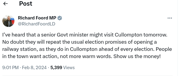Lib Dem MP for Tiverton and Honiton Richard Foord, the day before the visit, posted on X, wrote: “I’ve heard that a senior Govt minister might visit Cullompton tomorrow. No doubt they will repeat the usual election promises of opening a railway station, as they do in Cullompton ahead of every election. People in the town want action, not more warm words. Show us the money.