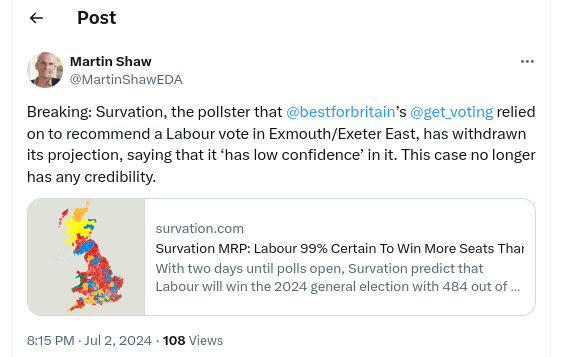 Breaking: Survation, the pollster that @bestforbritain’s @get_voting relied on to recommend a Labour vote in Exmouth/Exeter East, has withdrawn its projection, saying that it ‘has low confidence’ in it. This case no longer has any credibility.