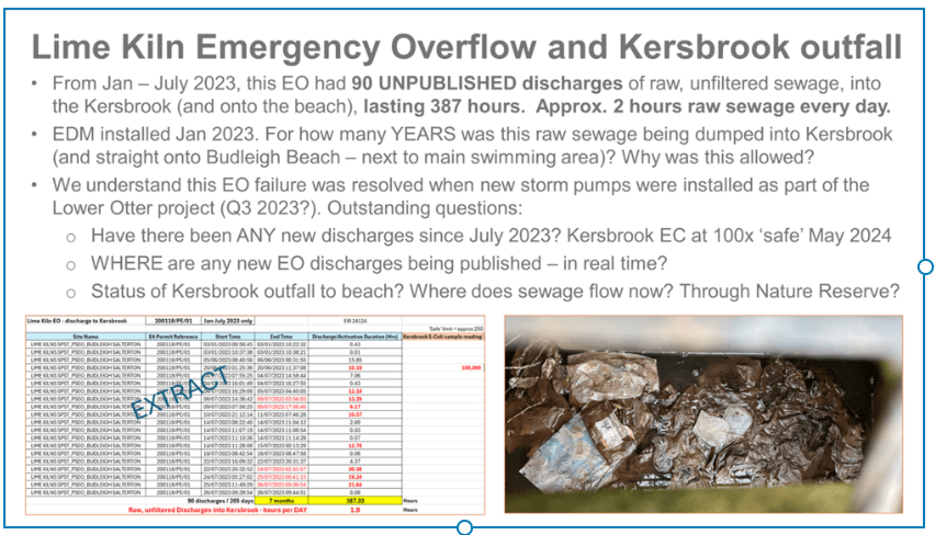 Comment: Although SWW state that they were not aware of an issue until April / May, I would point out that I posted (on Facebook) photos of a large number of tankers in Lime Kiln on 20th January 2024, and when we asked SWW what was going on, we were told then that they were lowering the level in the storm tanks. To us, this appeared unusual. We subsequently identified – and reported – exceptionally high numbers of short discharges going out of the CSO. I wrote a blog post on this, published on 18th February this year: https://fightingpoolution.com/2024/02/18/whats-really-happening-with-sewage-overflows-at-lime-kiln-budleigh/