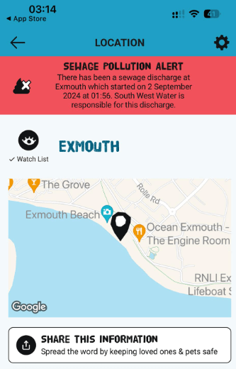 Surfers against Sewage map shows alerts at Exmouth, Budleigh, Sidmouth, Beer and Seaton