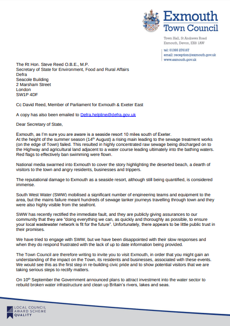 We hope you see this invitation in a positive light and feel you can use Exmouth as a ‘pilot scheme’ to realise Government intentions in promoting water companies working together with communities to implement immediate courses of action to provide permanent solutions to existing problems.