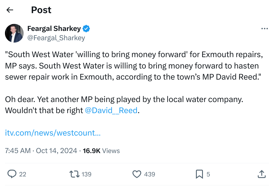 The red-flagged beaches prompted the town’s MP, David Reed (Conservative, Exmouth and Exeter East), to request a meeting with Susan Davy, the water company’s boss, with the four-week investigation by Pell Frischmann instigated shortly after.