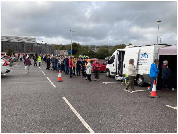 Apparently it was a similar situation at the Tesco car park in Axminster, excessively long queues with elderly people collapsing under the strain of extended standing times.