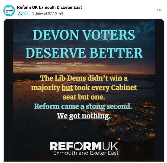 Updated 1900 to include an example from the Reform Exmouth and Exeter East face book page.