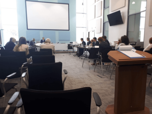 We are just having a pause to rearrange the tables so that the evidence can be heard by everyone in the room. …”