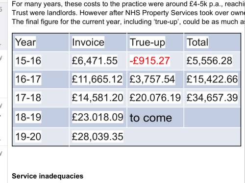 For many years, these costs to the practice were around £4-5k p.a., reaching £5.5k in 2015-16, the final year with North Devon NHS Trust were landlords. However after NHS Property Services took over ownership of the property in 2016, they escalated enormously. The final figure for the current year, including ‘true-up’, could be as much as £40,000.